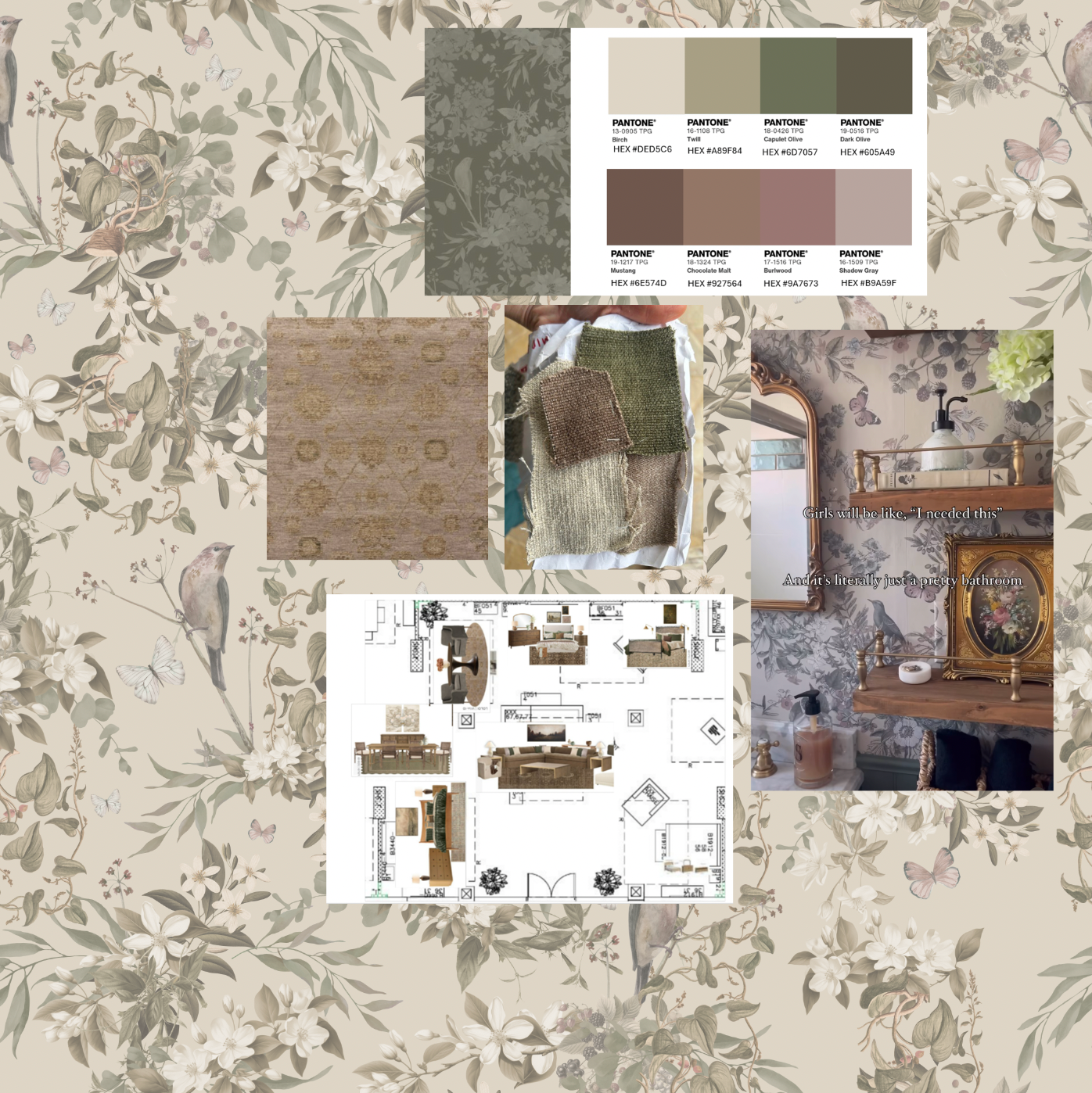 "Cypress" Oversized Wallpaper Mural & "Botanical" Wallpaper French Luxe each design printed 8' tall center wall 35'2" & two side walls each 4' 10" wide is backordered and will ship as soon as it is back in stock.